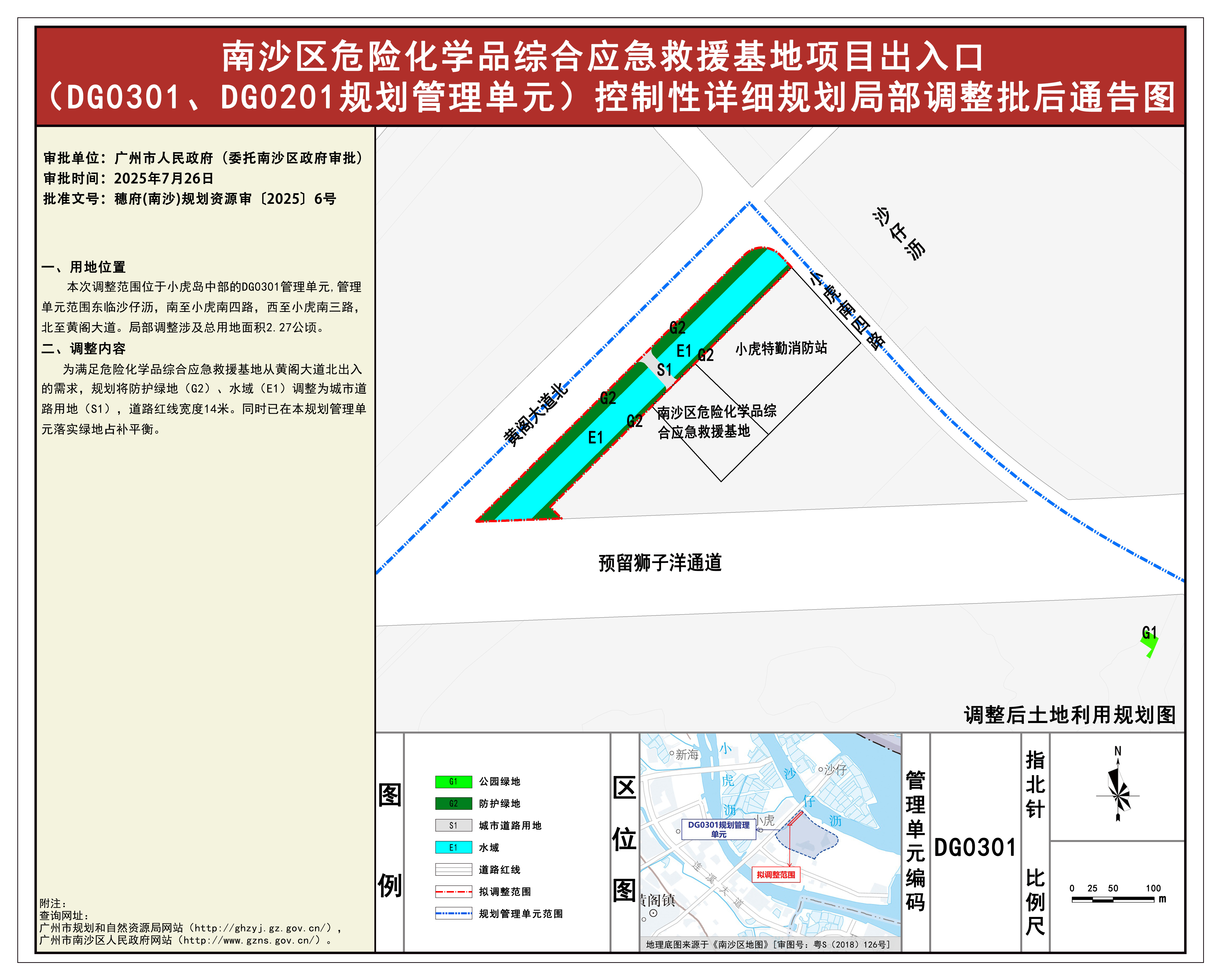 根据《广东省城市控制性详细规划管理条例》《广州市城乡规划程序规定》有关规定,《南沙区危险化学品综合应急救援基地项目出入口(DG0301、DG0201规划管理单元)控制性详细规划局部调整》已完成规划技术审查、批前公示等程序,并经广州市南沙新区自然资源规划与利用委员会审议通过后获广州市人民政府(委托南沙区政府)批准(穗府(南沙)规划资源审〔2025〕6号),自批准之日(2025年7月26日)起生效。
