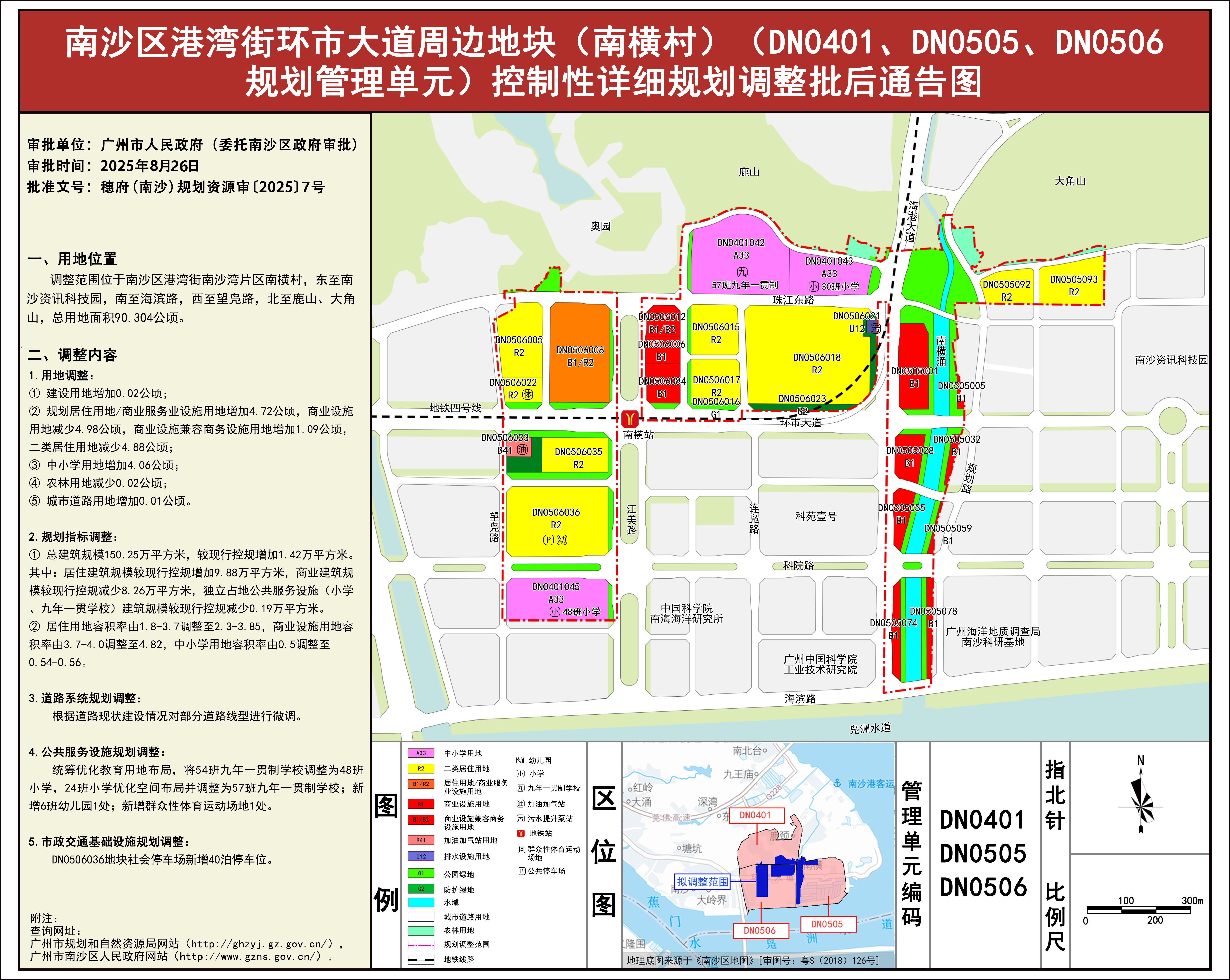 根据《广东省城市控制性详细规划管理条例》、广州市城乡规划程序有关规定,《南沙区南沙街环市大道北侧地块(大涌村)(DN0205、DN0303、DN0304规划管理单元)控制性详细规划调整》《南沙区南沙街环市大道北侧地块(广隆村)(DN0204、DN0301、DN0302规划管理单元)控制性详细规划调整》《南沙区港湾街英东大道南侧地块(东井村)(DN0402规划管理单元)控制性详细规划调整》《南沙区港湾街蒲州大道两侧地块(鹿颈村)(DN0401、DN0503规划管理单元)控制性详细规划调整》《南沙区港湾街环市大道周边地块(南横村)(DN0401、DN0505、DN0506规划管理单元)控制性详细规划调整》《南沙区东涌镇启新路东侧地块(DC0202、DC0206规划管理单元)控制性详细规划调整》已完成规划技术审查、批前公示等程序,并经广州市南沙新区自然资源规划与利用委员会审议通过后获广州市南沙区人民政府(受广州市人民政府委托)批准(穗府(南沙)规划资源审〔2025〕7号),自批准之日(2025年8月26日)起生效。