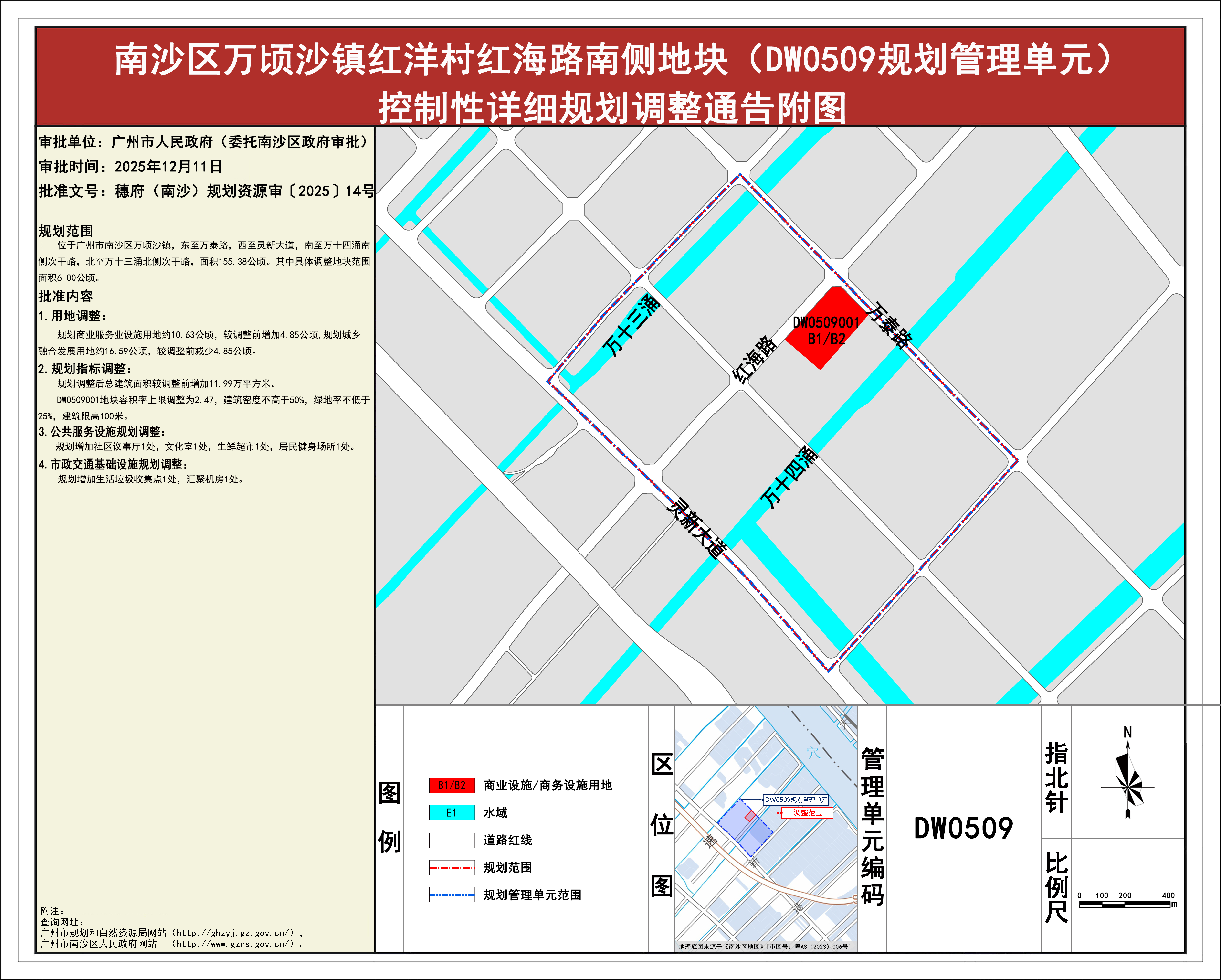 根据《广东省城市控制性详细规划管理条例》《广州市城乡规划程序规定》有关规定,《南沙区万顷沙镇红海路南侧地块(DW0509规划管理单元)控制性详细规划调整》已完成规划技术审查、批前公示等程序,并经广州市南沙新区自然资源规划与利用委员会审议通过后获广州市人民政府(委托南沙区政府)批准(穗府(南沙)规划资源审〔2025〕14号),自批准之日(2025年12月11日)起生效。