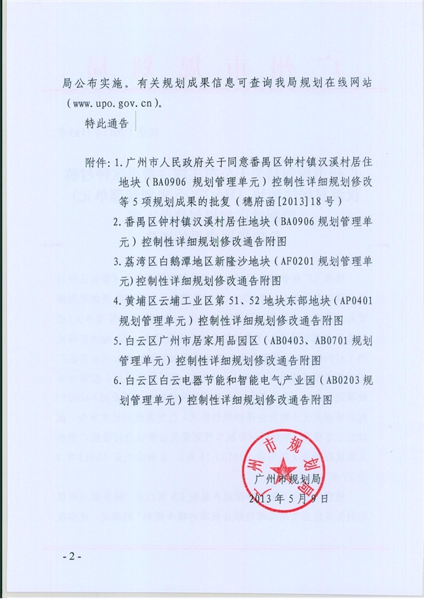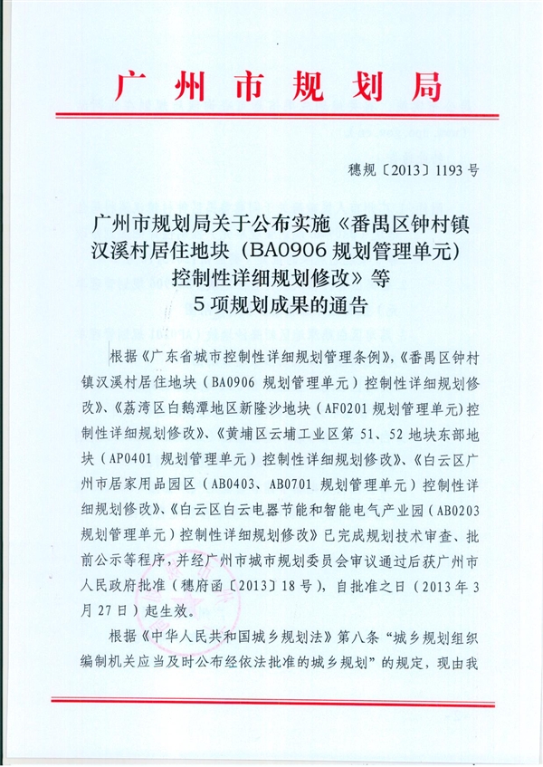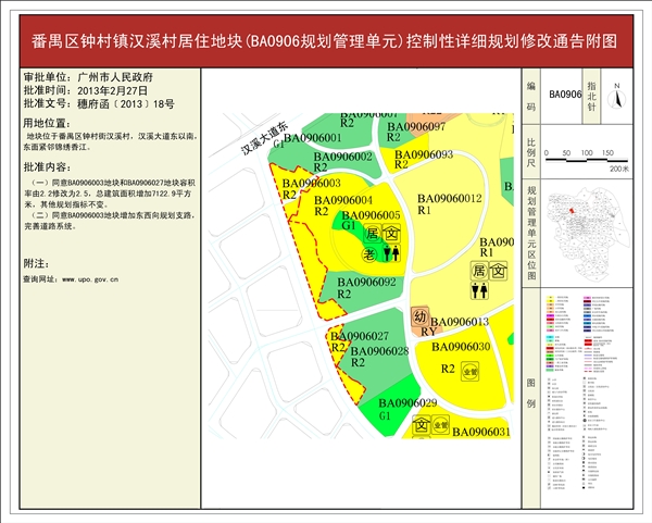 番禺区钟村镇汉溪村居住地块(BA0906规划管理单元)控制性详细规划修改通告