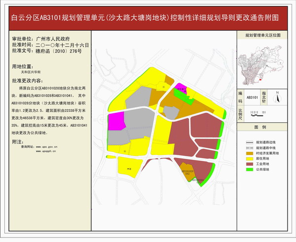 白云分区AB3101规划管理单元(沙太路大塘岗地块)控制性详细规划导则更改