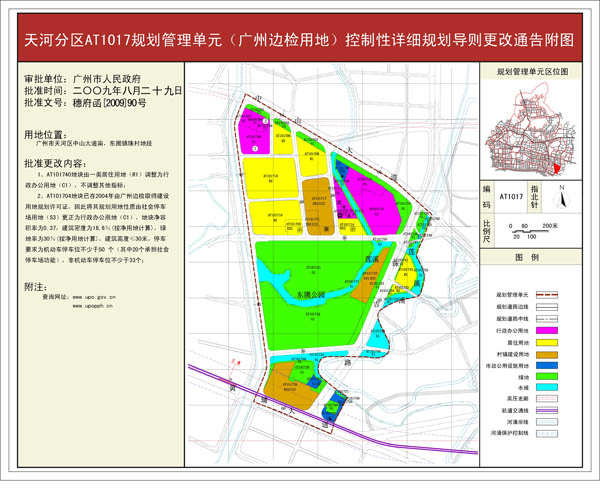 关于公布实施《天河分区AT1017规划管理单元(广州边检用地)控制性详细规划导则更改》一项规划成果的通告