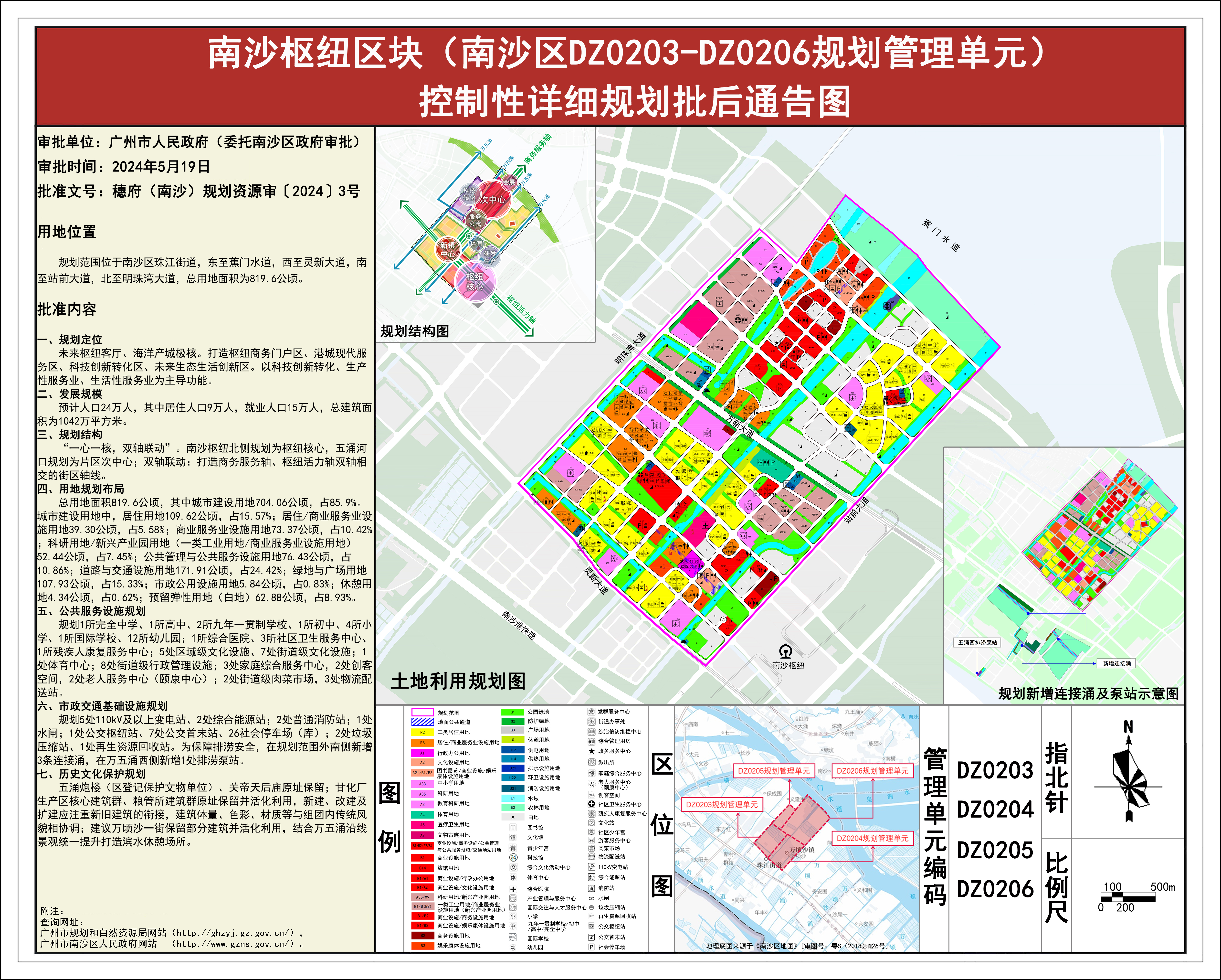 根据《广东省城市控制性详细规划管理条例》《广州市城乡规划程序规定》有关规定,《南沙枢纽区块(南沙区DZ0203-DZ0206规划管理单元)控制性详细规划》已完成规划技术审查、批前公示等程序,并经广州市南沙新区自然资源规划与利用委员会审议通过后获广州市南沙区人民政府(受广州市人民政府委托)批准(穗府(南沙)规划资源审〔2024〕3号),自批准之日(2024年5月19日)起生效。