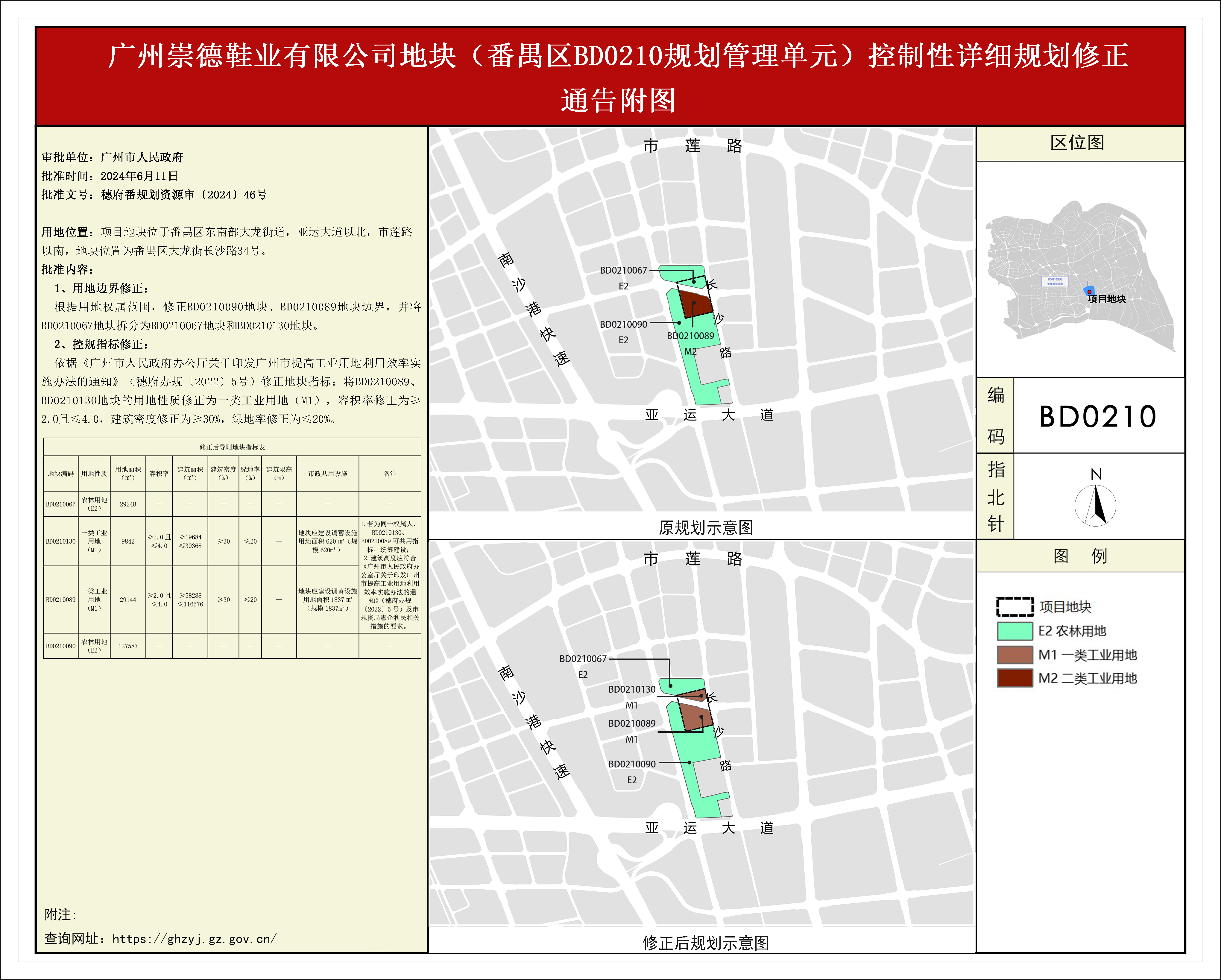 根据《广东省城市控制性详细规划管理条例》、《广州市城乡规划程序规定》有关规定,《广州崇德鞋业有限公司地块(番禺区BD0210规划管理单元)控制性详细规划修正》规划成果已完成规划技术审查、批前公示、征询相关单位意见等程序,并经番禺区土地和规划领导小组会议审议通过后获广州市人民政府批准(穗府番规划资源审﹝2024﹞46号),自批准之日(2024年6月11日)起生效。
