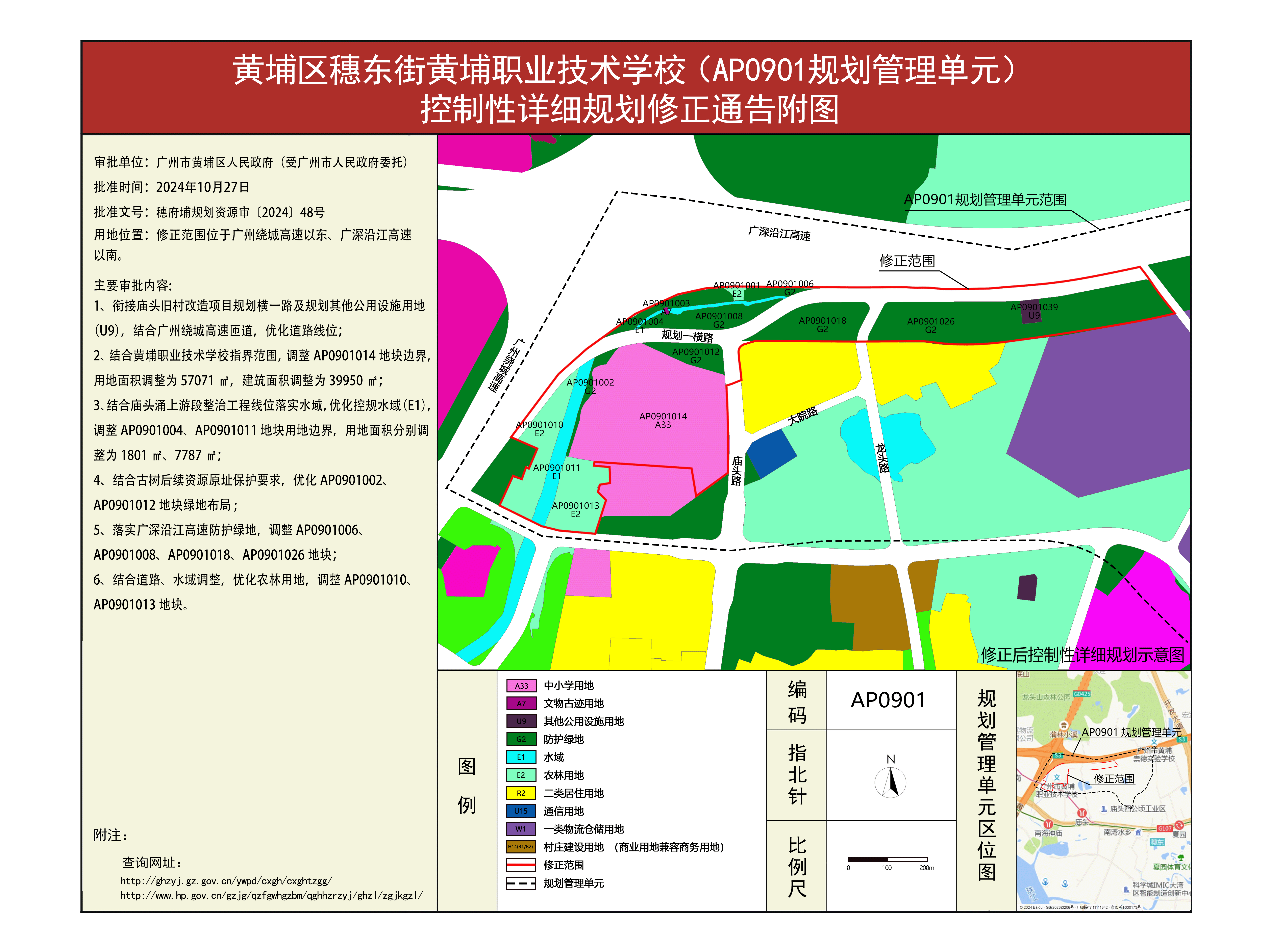 根据《广东省城市控制性详细规划管理条例》要求,《黄埔区穗东街黄埔职业技术学校(AP0901规划管理单元)控制性详细规划修正方案》已完成规划技术审查、批前公示等程序,并经黄埔区人民政府(受市人民政府委托)审议批准(穗府埔规划资源审〔2024〕48号),自批准之日(2024年10月27日)起生效。