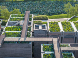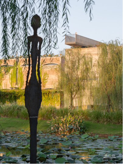 建筑屋面设置了近三十组不同尺寸的种植池,其中,种植于此的水生植物不仅是充满野趣的景观,更能降低建筑能耗。一条架空步道穿梭于屋面,从这里望去,种植池与下沉式庭院、周边的天然荷塘相互呼应,使春阳台成为一座融入环境、高低错落的“立体荷塘”。