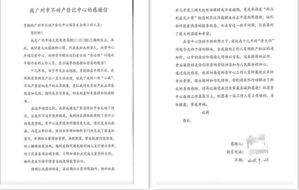 近日,广州市海天花苑金菊路商铺业主陈先生向市不动产登记中心赠送锦旗:“担当有为办实事,排忧解难暖民心”,并附感谢信表达对中心暖心服务的诚挚谢意。陈先生2010年购买的商铺因历史遗留原因,相关手续缺失长期无法办证,严重影响了房屋的租售经营及财产权益保障,成为陈先生的一块“心病”。