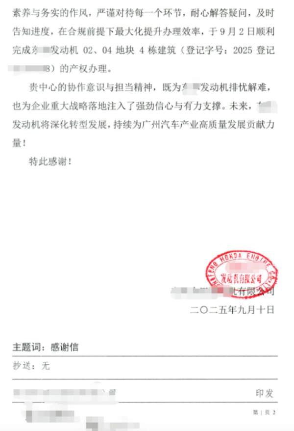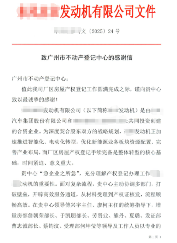某汽车发动机合资企业因业务转型需办理大批量厂区房屋产权登记。面对复杂流程,中心主动协调多个相关部门打通壁垒,开辟高效通道,从业务受理、审核到核发产权证,高效完成2宗地上4栋建筑的产权登记,切实解决企业的实际困难,为区域产业高质量发展提供有力支撑。该企业在感谢信中表示:“中心的协作意识与担当精神,为企业重大战略落地注入了强劲信心,为广州汽车产业高质量发展贡献力量。”