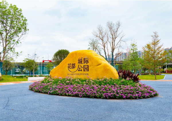 公园前身是新白广城际轨道上盖区域,其功能单调、封闭隔绝、停车杂乱,是典型的城市灰空间、低效率用地,公园设计通过生态重塑与功能升级,对标纽约高线公园,打造体育+文化+艺术+生态的城市线性公园,把封闭闲置的场地转化为开放共享的市民公园,成为花都区迎接十五运会的“活力城市秀场”。花都城际公园以“花都道”为理念(谐音“花都到”),在此汇聚最具花都特色的“花植物”,用国际范设计手法结合本土特色植物,将花元素融入空间设计,形成“花墙”“花树”“花瀑布”等多层次景观,共种植70余种特色花卉;选用大腹木棉、黄槐、凤凰木、宫粉紫荆等开花树种,搭配南洋楹、秋枫、仁面等常绿树种,累计种植乔木1552棵、灌木1695棵,形成四季有花、季相分明、繁花盛开的景观效果。在百花盛开时,公园将变成美不胜收的“花走廊”,同时吸引各方旅客和广州市民到此打卡。