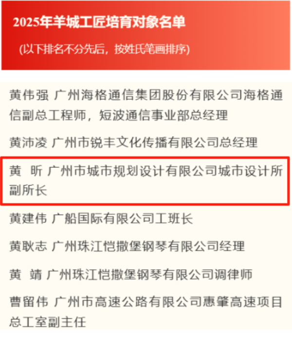 喜报!广州市城市规划设计有限公司黄昕同志入选广州市2025年度羊城工匠培育对象名单