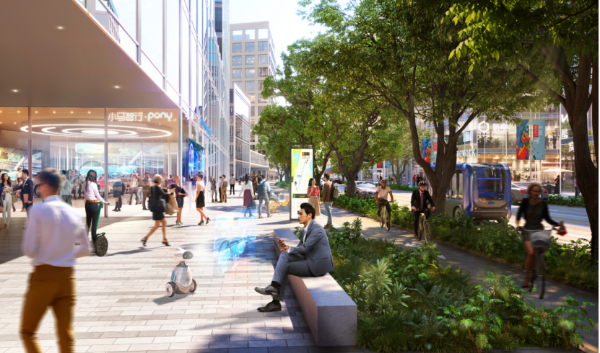 交通设计上,引入香港小窄密路系统,构建功能与文化交融的特色街道网络。“嘉学路”通过窄退线、弹性车道设计,串联香港科技大学(广州)与庆盛枢纽,营造紧凑活力的创业界面;“创智路”融合岭南骑楼与香港五彩招牌,连接生活区与地铁站,还原粤港两地共有的街道生活场景。两条街道在大学广场交汇,与香港科技大学(广州)正门形成视觉呼应,推动校区、园区、社区“三区”无界融合,让港籍师生与居民便捷享受街道交流空间。