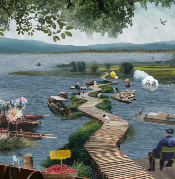 作品《龙江水岸·智慧派潭——派潭世界级生态休闲度假小镇概念方案》以“活力旅居”为引擎,打造石马龙田园旅居综合体,融合生态居住与趣味体验,串联白水寨风景区资源,形成一站式度假动线。同时深度融入客家民俗文化,通过定期举办祈福仪式、传统音乐表演等特色活动,实现自然生态与人文情感的双重连接。