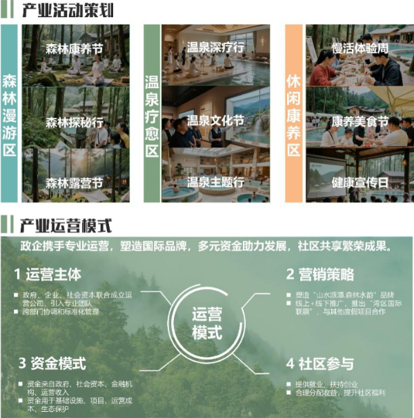 产业策划方面,深入研判地域资源禀赋与市场潜力,聚焦生态疗愈、体育科技、农旅融合等细分方向,塑造具有高度识别度的产业标签,构建差异化特色化的可持续发展格局。