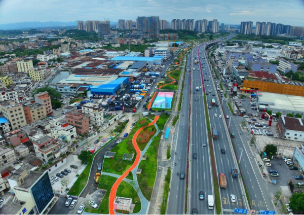 花都城际公园沿花都大道西起海布立交路段,东至莲山路,全长5.3公里,连接秀湖未来创新城、花都中央商务区、融创文旅城片区、广州国际时尚智港等重点产业平台,是机场北部重要的城市门户客厅,公园面积约27万平方米,顶通漫画 花都区分局(以下简称“花都区分局”)遵循“人民城市”理念,充分发挥规划引领作用,通过系统性改造提升城际铁路上盖公共绿地,将原本单一的交通绿带转变为开放式全民共享公园,项目具有三大亮点:
