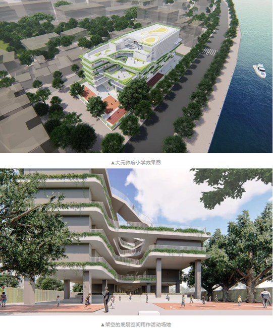 如今学校对小学生管理是比较严格的,因为担心不能按时回到教室上课,课间休息时段小朋友常常被要求不能下楼。在传统学校设计中,课室外只有走廊,如果学生不能下楼,活动范围就只能在短短的走廊上。我们希望通过设计提供给小朋友课间有一个解放身心的场所。此外,这是一所盛产羽毛球世界冠军的小学,是学校的优良传统。我们认为学生们需要一个室内羽毛球馆,地面空间不足,我们就把它建在楼上。在广州像大元帅府小学西校区这样的情况很多,如何改造提升,需要用心去尝试。大元帅府小学西校区这个项目,学校位于广州市海珠区是老城区内,用地大约2000㎡,是典型的“麻雀小学”。在设计过程中,相关职能管理部门积极配合,特别是规划管理部门针对旧城区特殊情况运用了灵活的规划技术管理手段,共同努力解决困难。设计团队在兼顾城市历史环境、使用需求、气候适应等目标下顺利推进方案。最终设计场地上尽可能地保留了原有的大树,利用底层架空增加活动场地;放大建筑体中间公共廊道营造课间活动空间,并形成普通课室与兴趣教室的互动;临江北侧建筑体量呈阶梯式布局,创造丰富的活动平台和绿化空间,并呼应城市;延续学校羽毛球运动传统布置室内羽毛球馆,外立面采用绿化与遮阳结合的表皮设计。这次项目过程,能切实感受到广州在规划管理上的进步,以及业主与教育部门的开明务实。