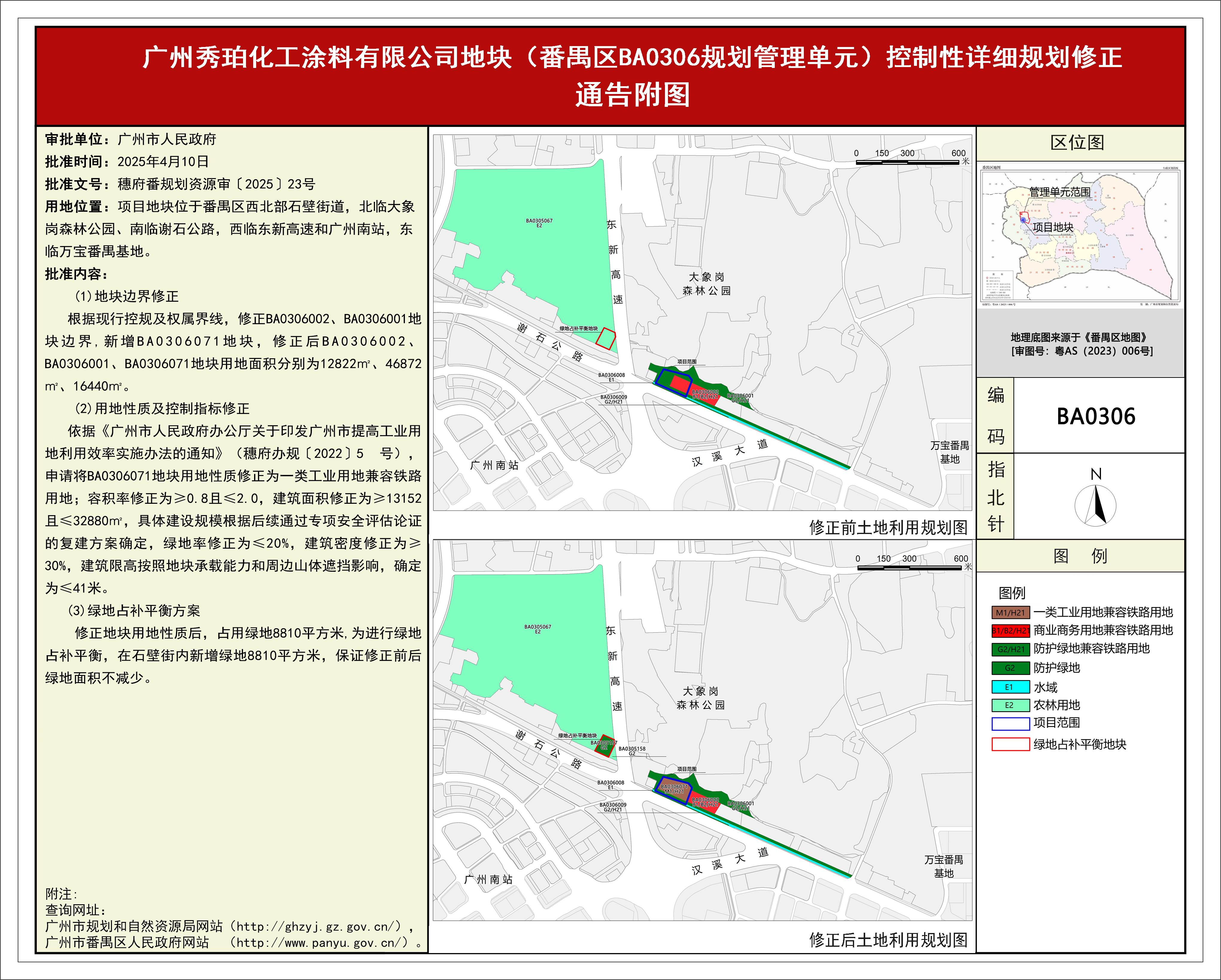 根据《广东省城市控制性详细规划管理条例》、《广州市人民政府关于将一批市级行政职权事项继续委托区实施的决定》(穗府〔2019〕8号)、《广州市人民政府关于收回一批市级行政权力事项的决定》(广州市人民政府令第188号),《广州秀珀化工涂料有限公司地块(番禺区BA0306规划管理单元)控制性详细规划修正》规划成果已完成批前公示、征询相关单位意见等程序,并经区政府常务会议纪要十八届138次审议通过后,获广州市人民政府批准(穗府番规划资源审〔2025〕23号),自批准之日(2025年4月10日)起生效。