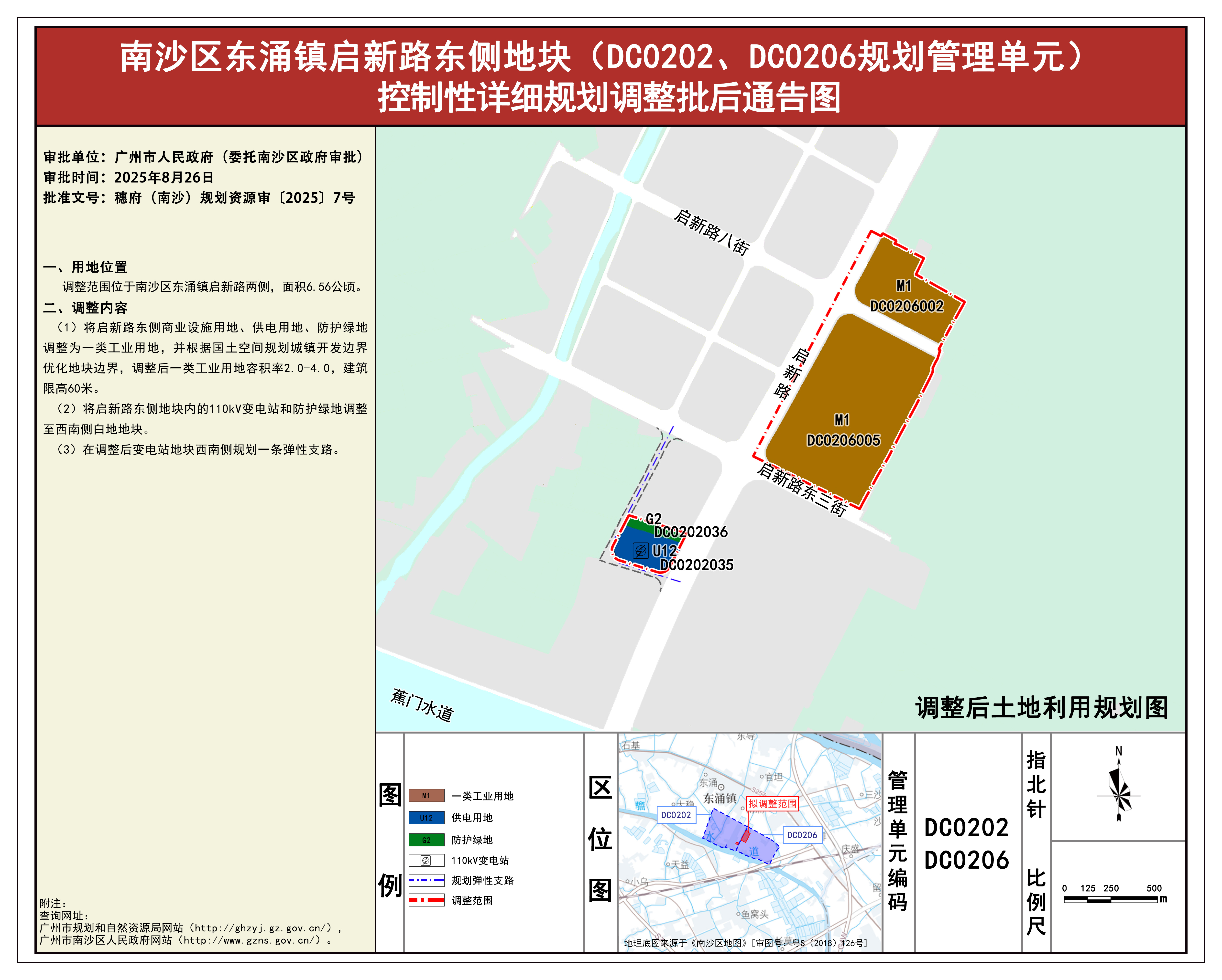 根据《广东省城市控制性详细规划管理条例》、广州市城乡规划程序有关规定,《南沙区南沙街环市大道北侧地块(大涌村)(DN0205、DN0303、DN0304规划管理单元)控制性详细规划调整》《南沙区南沙街环市大道北侧地块(广隆村)(DN0204、DN0301、DN0302规划管理单元)控制性详细规划调整》《南沙区港湾街英东大道南侧地块(东井村)(DN0402规划管理单元)控制性详细规划调整》《南沙区港湾街蒲州大道两侧地块(鹿颈村)(DN0401、DN0503规划管理单元)控制性详细规划调整》《南沙区港湾街环市大道周边地块(南横村)(DN0401、DN0505、DN0506规划管理单元)控制性详细规划调整》《南沙区东涌镇启新路东侧地块(DC0202、DC0206规划管理单元)控制性详细规划调整》已完成规划技术审查、批前公示等程序,并经广州市南沙新区自然资源规划与利用委员会审议通过后获广州市南沙区人民政府(受广州市人民政府委托)批准(穗府(南沙)规划资源审〔2025〕7号),自批准之日(2025年8月26日)起生效。