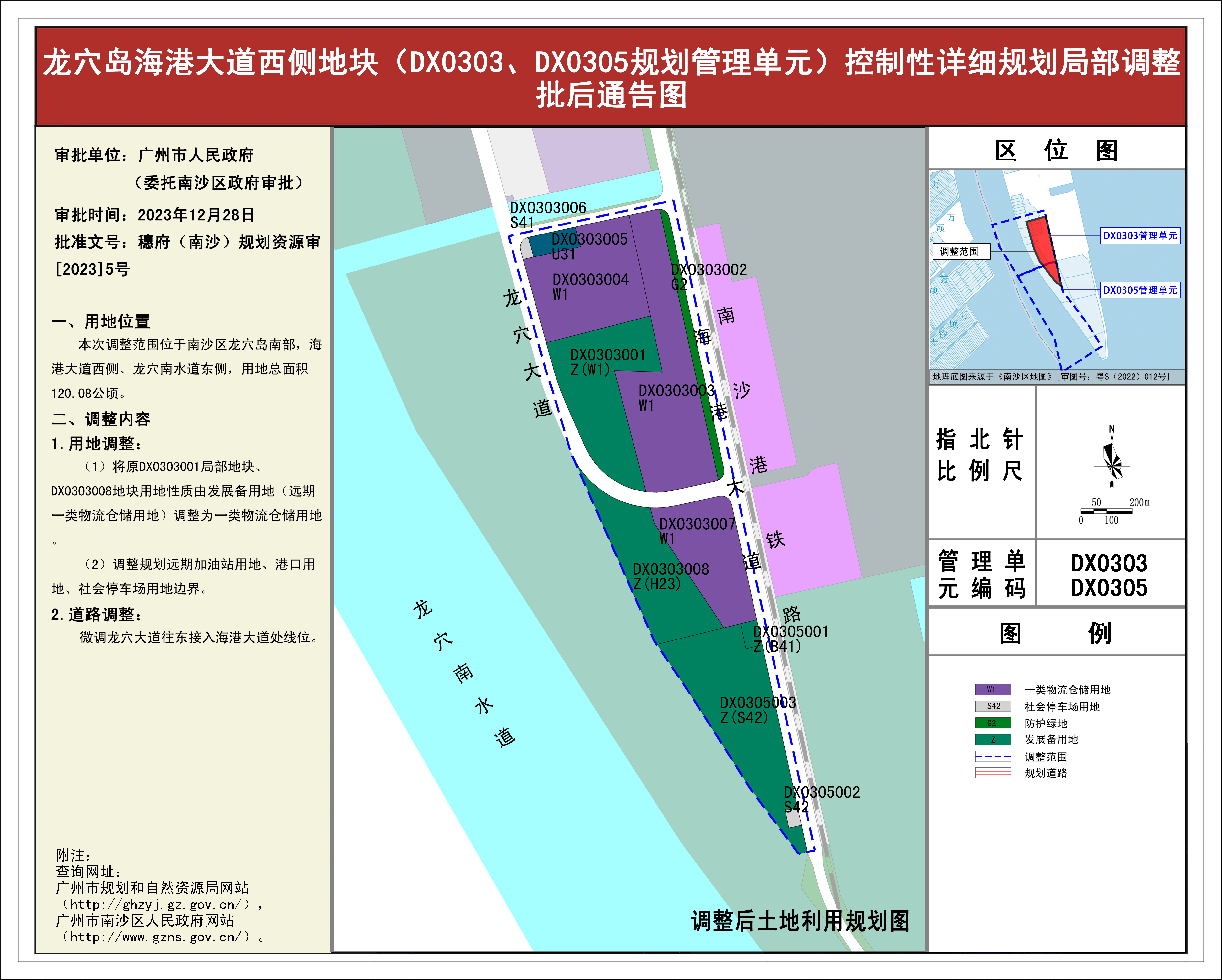 根据《广东省城市控制性详细规划管理条例》《广州南沙新区控制性详细规划制定办法》有关规定,《万顷沙红莲路东侧地块(DW0303)规划管理单元)控制性详细规划局部调整》《珠江街万环东路东侧地块(DZ0304管理单元)控制性详细规划局部调整》《南沙街明珠湾大桥东侧地块(DN0403管理单元)控制性详细规划局部调整》《东涌镇南涌村旧厂改造地块(DC0201、DC0202管理单元)控制性详细规划局部调整》《龙穴岛凫洲水道南侧地块(DX0102管理单元)控制性详细规划局部调整》《龙穴岛海港大道西侧地块(DX0303、DX0305规划管理单元)控制性详细规划局部调整》《南沙街大涌东路地块(DN0304规划管理单元)控制性详细规划局部调整》《南沙街海滨路北侧地块(DN0403管理单元)控制性详细规划局部调整》已完成规划技术审查、批前公示等程序,并经广州市南沙新区自然资源规划与利用委员会审议通过后获广州市南沙区人民政府(受广州市人民政府委托)批准(穗府(南沙)规划资源审〔2023〕5号),自批准之日(2023年12月28日)起生效。