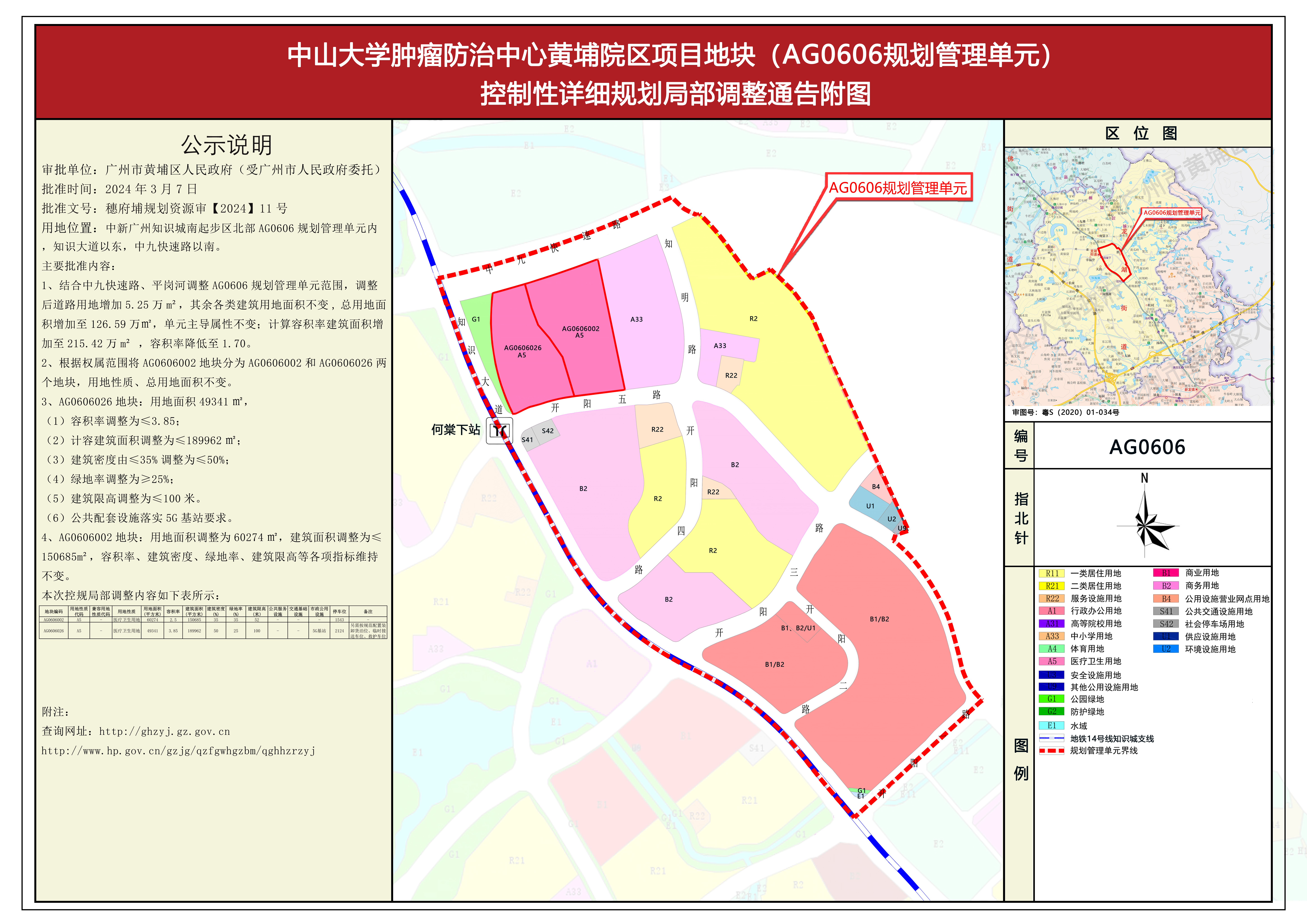 根据《广东省城市控制性详细规划管理条例》要求,《中山大学肿瘤防治中心黄埔院区项目地块(AG0606 规划管理单元)控制性详细规划局部调整》已完成规划技术审查、批前公示等程序,并经广州市黄埔区、广州开发区城乡规划委员会专家和公众代表委员审议控规局部调整会议审议通过后获黄埔区人民政府(受市人民政府委托)批准(穗府埔规划资源审(2024)11号),自批准之日(2024年3月7日)起生效。
