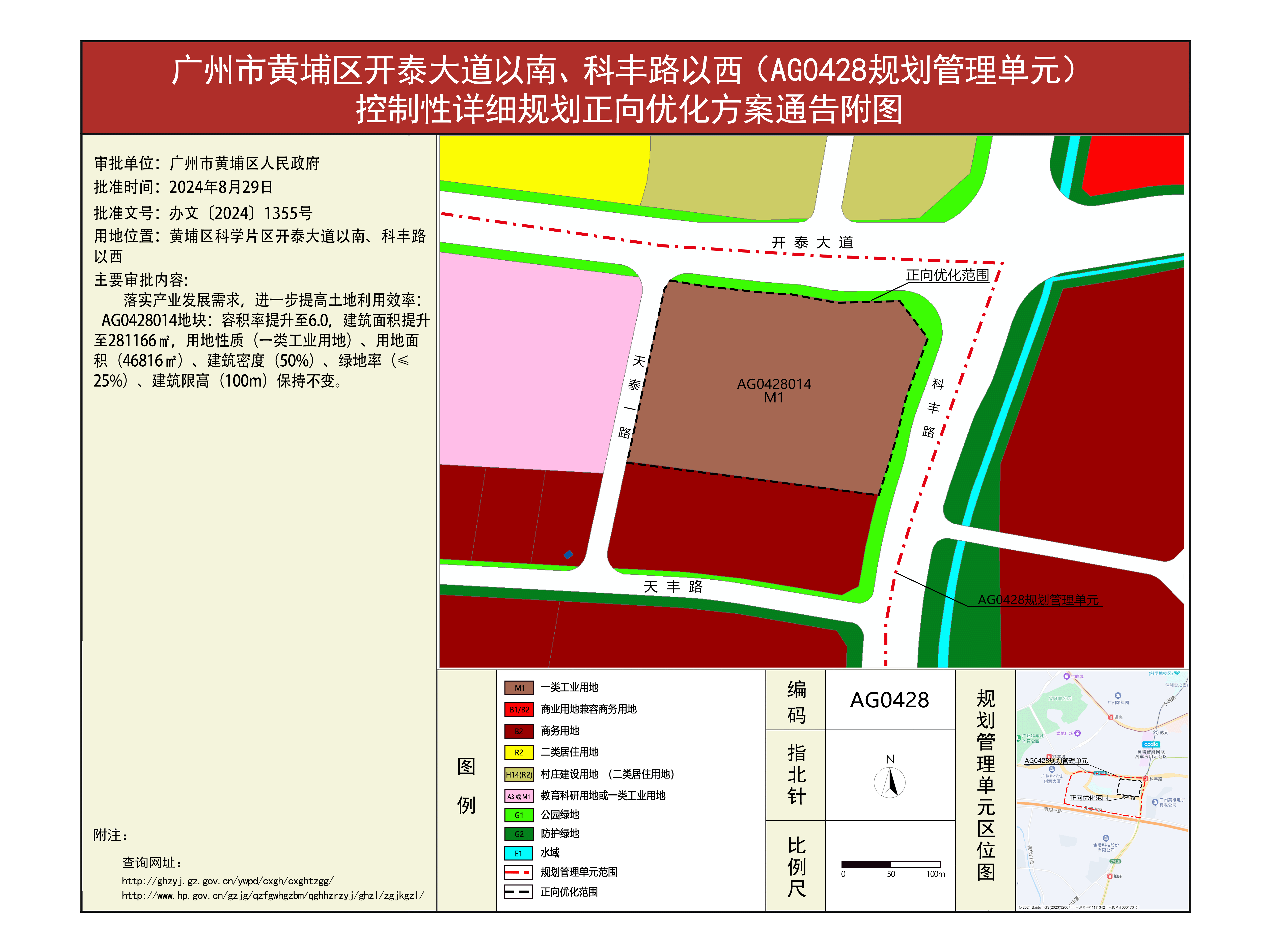 根据《广东省城市控制性详细规划管理条例》要求,《黄埔区开泰大道以南、科丰路以西(AG0428规划管理单元)控制性详细规划正向优化方案》已完成规划技术审查、批前公示等程序,并经广州开发区管理委员会审议批准(办文〔2024〕1355号),自批准之日(2024年8月29日)起生效。