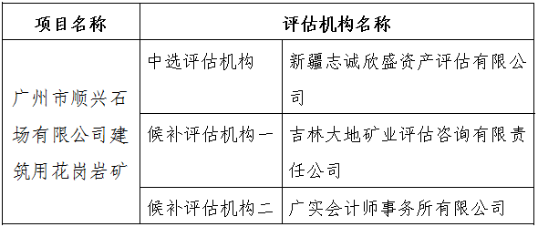 按照《广东省国土资源厅关于进一步加强和规范采矿权评估管理工作的通知》(粤国土资矿管发﹝2013﹞344号)精神,我委于2017年9月28日下午在广州市豪贤路193号14楼1号会议室公开摇号选择“广州市顺兴石场有限公司建筑用花岗岩矿”价款评估机构,现将摇号结果公布如下: