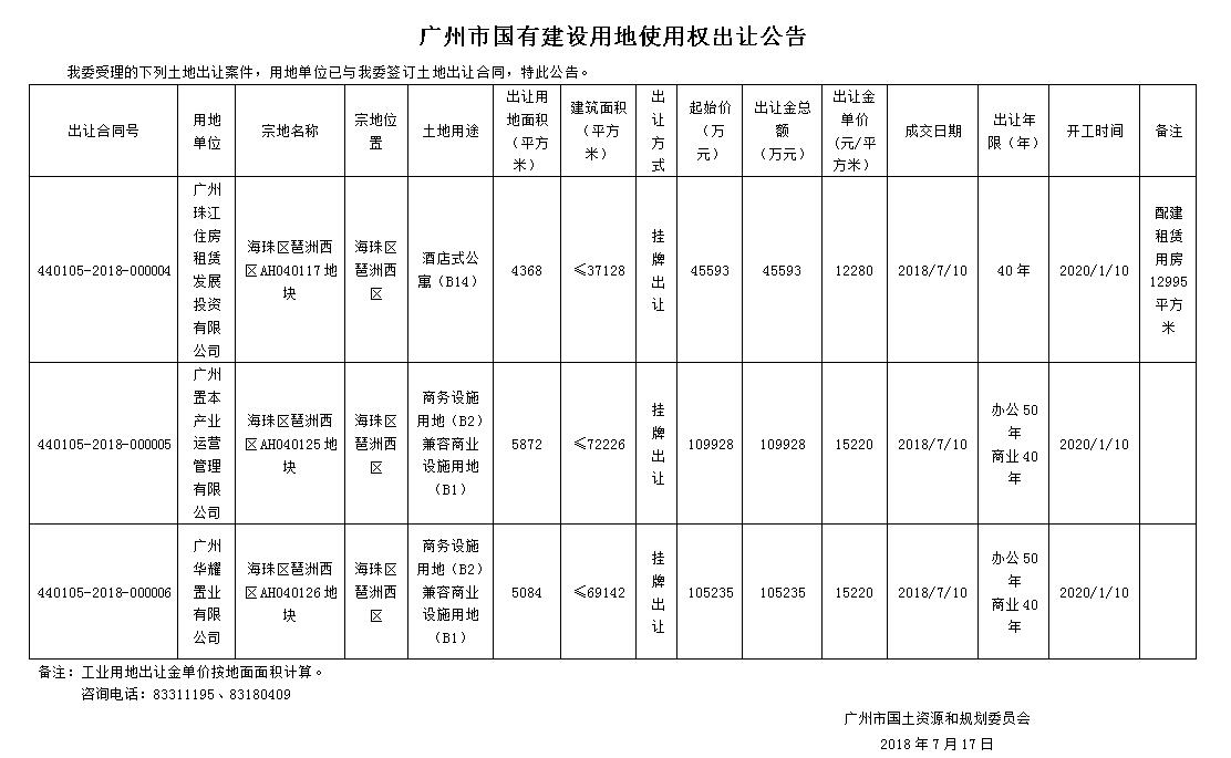 广州市国有建设用地使用权出让公告(2018年7月10日成交地块)