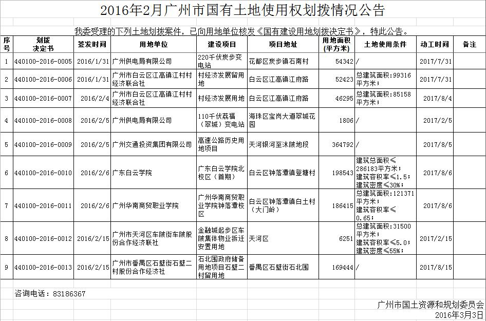 2016年2月广州市国有土地使用权划拨情况公告