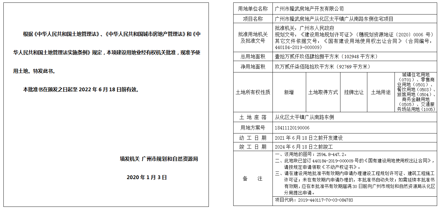 建设用地批准书(穗规划资源建用字〔2020〕4号)