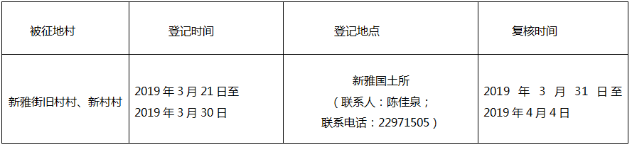 经广东省人民政府批准(粤府土审(02)〔2019〕15号文),需将广州市花都区新雅街旧村村、新村村属下的集体土地6.2415公顷(合93.6225亩)征收为国有土地。现将经依法批准的《征收土地方案》和市人民政府批准的《征地补偿安置方案》内容以及有关事项公告如下:
