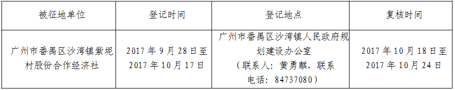 经广东省人民政府批准(粤国土资(建)字〔2017〕446号文),同意将广州市番禺区沙湾镇紫坭村股份合作经济社,面积共5.4916公顷集体土地征收为国有土地。现将经依法批准的《征收土地方案》、市人民政府批准的《征地补偿安置方案》内容和有关事项公告如下: