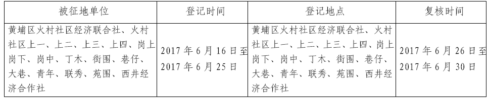 经省人民政府批准(粤国土资(建)字〔2017〕54号文),需将广州市黄埔区火村社区经济联合社、火村社区上一、上二、上三、上四、岗上、岗下、岗中、丁木、街围、巷仔、大巷、青年、联秀、苑围、西井经济合作社共4.6648公顷(合69.9720亩)集体土地征收为国有土地。现将经依法批准的《征收土地方案》和市人民政府批准的《征地补偿安置方案》内容和有关事项公告如下: