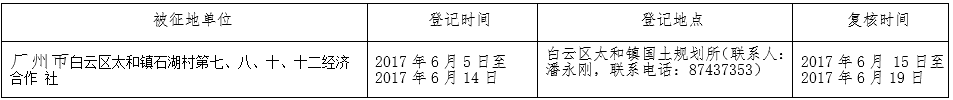 经广州市人民政府同意并经广东省人民政府批准(粤国土资(建)字〔2017〕239号)同意将白云区广从路105国道太和镇石湖村段东侧地段31.9672公顷集体土地征收为国有土地。现将经依法批准的《征收土地方案》、市人民政府批准的《征地补偿安置方案》内容和有关事项公告如下: