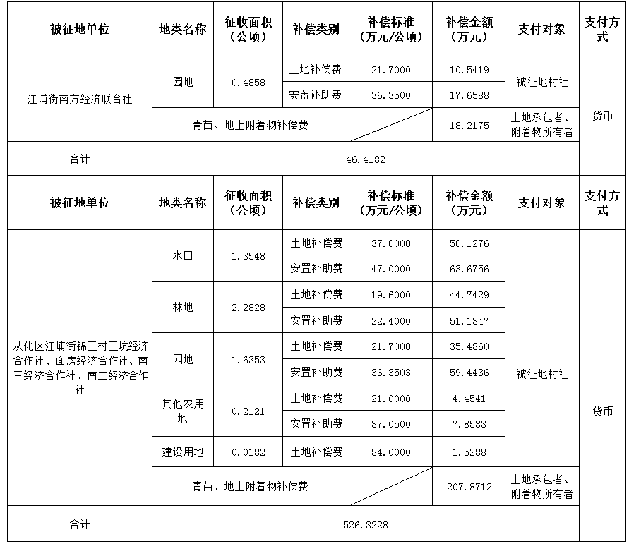 (二)本次征收土地所涉及的被安置农业人员由从化区江埔街南方村南方经济联合社,锦三村三坑经济合作社、面房经济合作社、南二经济合作社、南三经济合作社以货币补偿等形式安置。