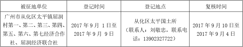 经广州市人民政府同意并经广东省人民政府批准(粤国土资(建)字〔2015〕1463号)同意将广州市从化区太平镇屈洞村地段11.5637公顷集体土地征收为国有土地。现将经依法批准的《征收土地方案》、市人民政府批准的《征地补偿安置方案》内容和有关事项公告如下: