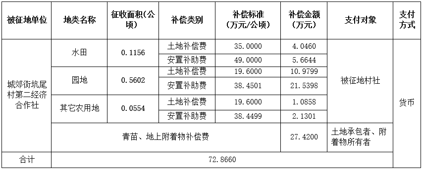 经广州市人民政府同意并经广东省人民政府批准(粤国土资(建)字〔2015〕1395号)同意将广州市从化区城郊街坑尾村地段0.7312公顷集体土地征收为国有土地。现将经依法批准的《征收土地方案》、市人民政府批准的《征地补偿安置方案》内容和有关事项公告如下: