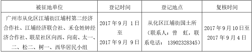 经广州市人民政府同意并经广东省人民政府批准(粤国土资(建)字〔2017〕402号)同意将广州市从化区江埔街联星社区、禾仓姓钟经济合作社、江埔村地段4.4079公顷集体土地征收为国有土地。现将经依法批准的《征收土地方案》、市人民政府批准的《征地补偿安置方案》内容和有关事项公告如下: