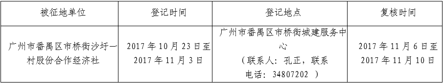 经广东省人民政府批准(粤国土资(建)字〔2017〕508号文),同意将广州市番禺区市桥街沙圩一村股份合作经济社,面积共1.0862公顷集体土地征收为国有土地。现将经依法批准的《征收土地方案》、市人民政府批准的《征地补偿安置方案》内容和有关事项公告如下: