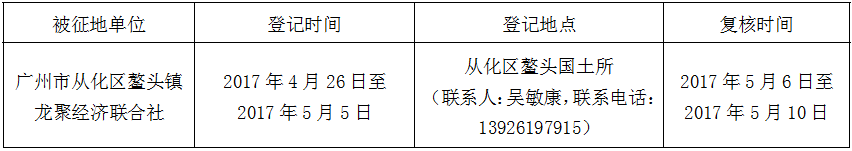 经广州市人民政府同意并经广东省人民政府批准(粤国土资(建)字〔2016〕524号)同意将广州市从化区鳌头镇龙聚村0.6953公顷集体土地征收为国有土地。现将经依法批准的《征收土地方案》、市人民政府批准的《征地补偿安置方案》内容和有关事项公告如下: