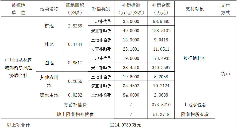 (二)本次征收土地所涉及的被安置农业人员由广州市从化区城郊街东风经济联合社以货币补偿等形式安置。