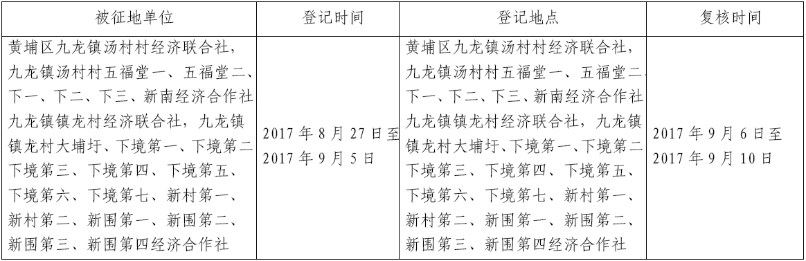 (二)本次征收土地所涉及的被安置农业人员由广州市黄埔区九龙镇汤村村经济联合社,九龙镇汤村村五福堂一、五福堂二、下一、下二、下三、新南经济合作社,九龙镇镇龙村经济联合社,九龙镇镇龙村大埔圩、下境第一、下境第二、下境第三、下境第四、下境第五、下境第六、下境第七、新村第一、新村第二、新围第一、新围第二、新围第三、新围第四经济合作社在本公告期内到广州开发区广州市黄埔区国土资源和规划局领取办理安置农业人口征地农转非手续的函件。