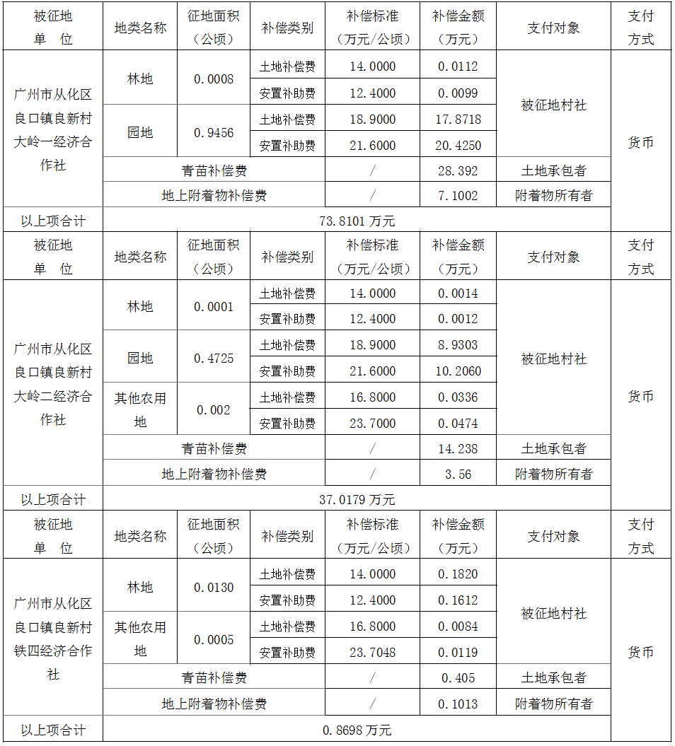 (二)本次征收土地所涉及的被安置农业人员由广州市从化区良口镇良新村大岭一、大岭二、铁四经济合作社以货币补偿等形式安置。
