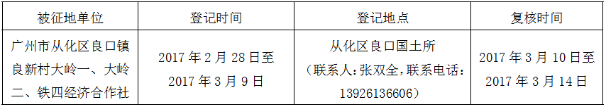经广州市人民政府同意并经广东省人民政府批准(粤国土资(建)字〔2017〕16号)同意将广州市从化区良口镇良新村地段1.4345公顷集体土地征收为国有土地。现将经依法批准的《征收土地方案》、市人民政府批准的《征地补偿安置方案》内容和有关事项公告如下: