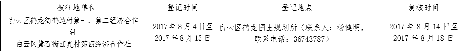 经广州市人民政府同意并经广东省人民政府批准(粤国土资(建)字〔2017〕387号)同意将白云区鹤龙街鹤边村第一、第二经济合作社和黄石街江夏村第四经济合作社属下的集体土地征收为国有土地。现将经依法批准的《征收土地方案》、市人民政府批准的《征地补偿安置方案》内容和有关事项公告如下: