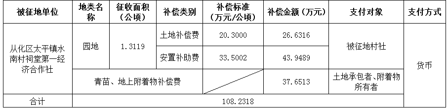 (二)本次征收土地所涉及的被安置农业人员由广州市从化区太平镇水南村祠堂第一经济合作社以货币补偿等形式安置。