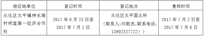经广州市人民政府同意并经广东省人民政府批准(粤国土资(建)字〔2017〕247号)同意将广州市从化区太平镇水南村地段1.3119公顷集体土地征收为国有土地。现将经依法批准的《征收土地方案》、市人民政府批准的《征地补偿安置方案》内容和有关事项公告如下: