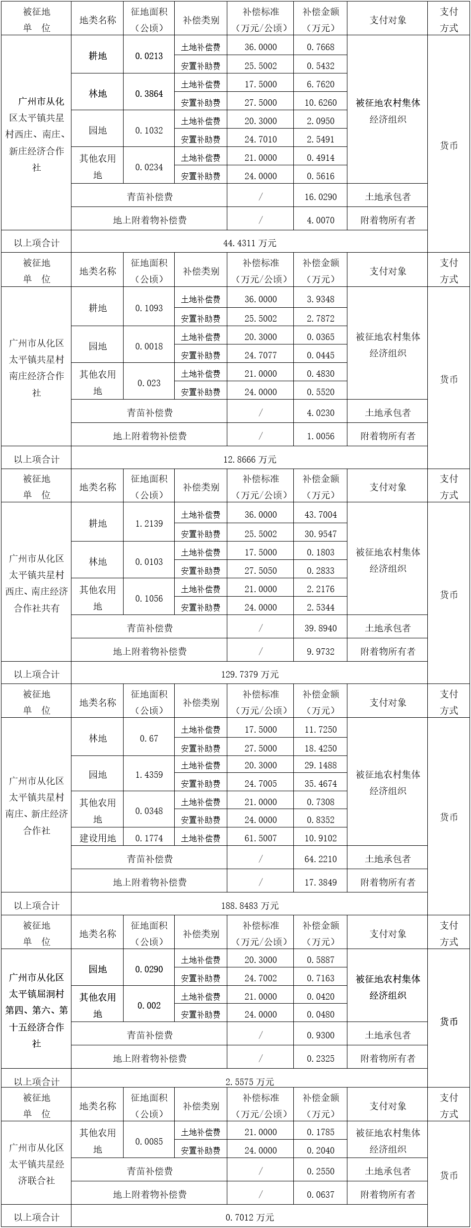 (二)本次征收土地所涉及的被安置农业人员由广州市从化区太平镇共星村西庄、南庄、新庄经济合作社,共星经济联合社,屈洞村第四、第六、第十五经济合作社以货币补偿等形式安置。