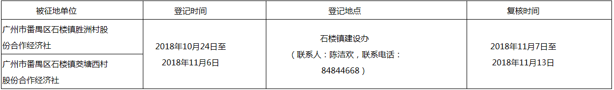 (二)本次征收土地所涉及的被安置农业人员由广州市番禺区石楼镇胜洲村股份合作经济社和广州市番禺区石楼镇茭塘西村股份合作经济社以货币补偿的形式安置。请广州市番禺区石楼镇胜洲村股份合作经济社和广州市番禺区石楼镇茭塘西村股份合作经济社在本公告期内到广州市番禺区国土资源和规划局领取办理安置农业人口征地农转非手续的函件。