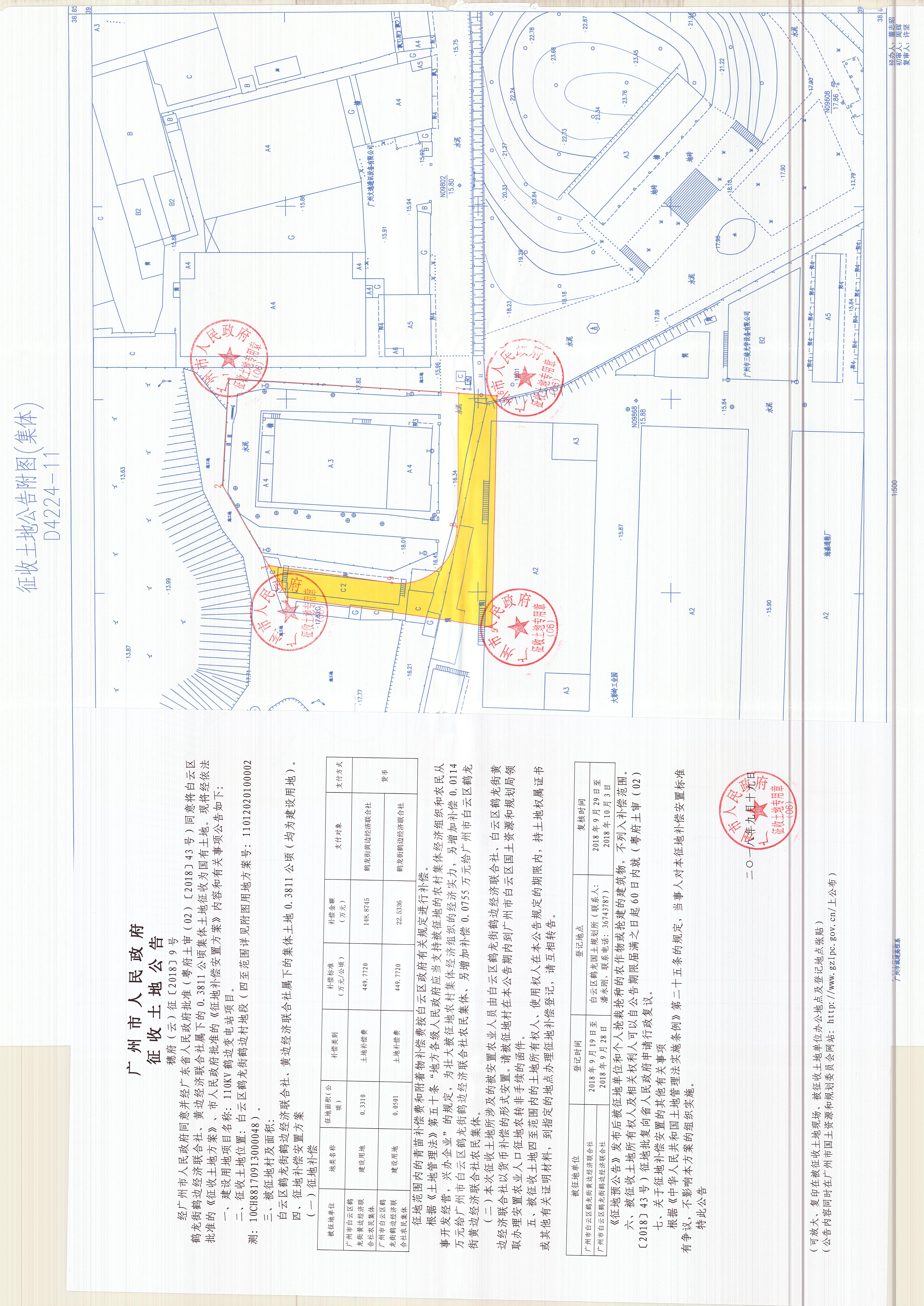 经广州市人民政府同意并经广东省人民政府批准(粤府土审(02)〔2018〕43号)同意将白云区鹤龙街鹤边经济联合社、黄边经济联合社属下的0.3811公顷集体土地征收为国有土地。现将经依法批准的《征收土地方案》、市人民政府批准的《征地补偿安置方案》内容和有关事项公告如下: