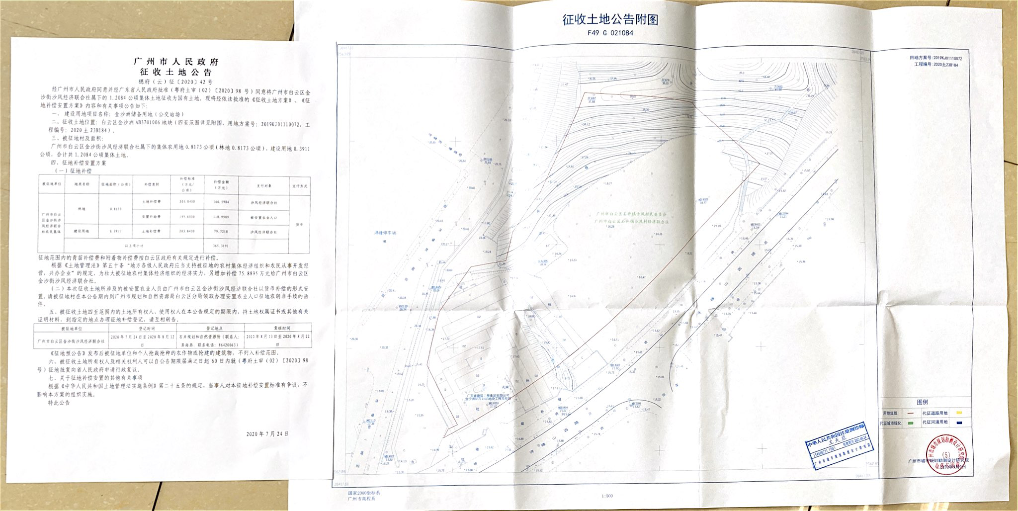 经广州市人民政府同意并经广东省人民政府批准(粤府土审(02)〔2020〕98号)同意将广州市白云区金沙街沙凤经济联合社属下的1.2084公顷集体土地征收为国有土地。现将经依法批准的《征收土地方案》、《征地补偿安置方案》内容和有关事项公告如下: