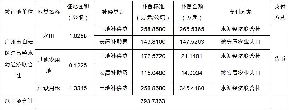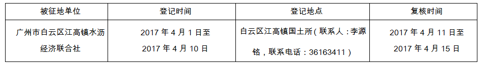 经广州市人民政府同意并经广东省人民政府批准(粤国土资(建)字〔2017〕91号)同意将白云区江高镇水沥村地段2.4828公顷集体土地征收为国有土地。现将经依法批准的《征收土地方案》、市人民政府批准的《征地补偿安置方案》内容和有关事项公告如下: